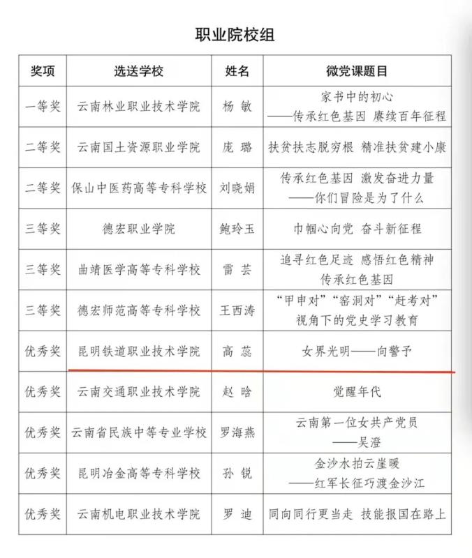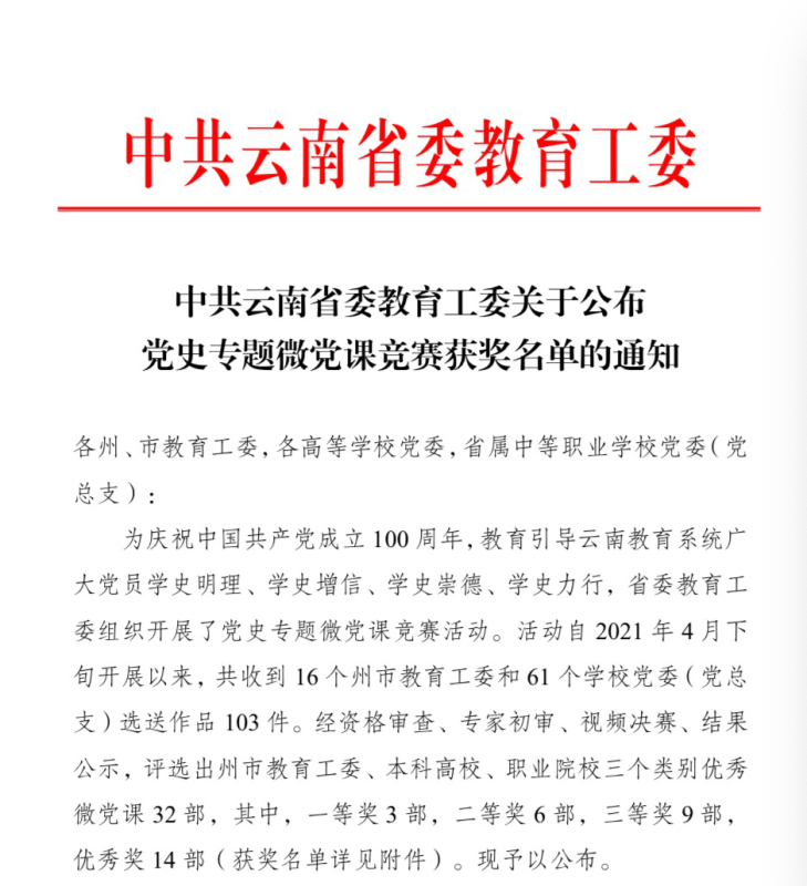 近日,中共云南省委教育工委下发《中共云南省委教育工委关于公布党史专题微党课竞赛获奖名单的通知》,经资格审查、专家初审、视频决赛、结果公示,我院高蕊老师讲授的微党课《女界光明——向警予》荣获职业院校组优秀奖。