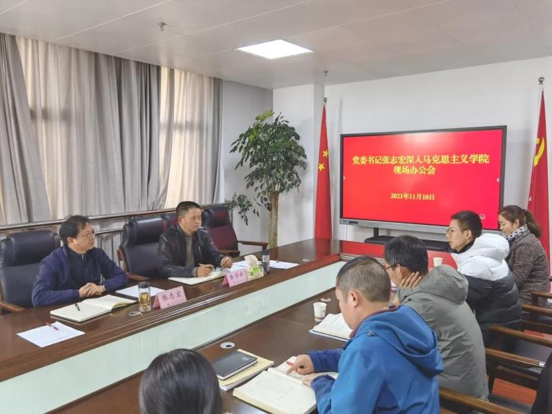 张志宏强调,马克思主义学院要紧扣内涵式发展要求,进一步加强内部建设,切实发挥好职能职责作用。一要准确把握形势。党和国家对思政课建设非常重视,要充分认识新时代马克思主义学院和思政课建设的重大意义,要抓好马克思主义学院主阵地和思想政治理论课主渠道建设。二要加强自身建设。要强化组织建设,选优配强党支部委员会委员,切实发挥好党支部的战斗堡垒作用和党员的先锋模范作用,通过党建引领,促进制度建设、队伍建设和业务建设,增强团队凝聚力和向心力,打造一支高水平、专业化的思想政治理论课教师队伍。持续加强对青年教师的教育和培养,让师资队伍“活起来”,切实增强思政课教师的使命感、认同感和获得感。三要提升教学成效。要着力深化教学、科研改革,创新教学方法,突出实践教学,鼓励科研创新,将思想政治理论课建设成为广大学生真心喜爱、终身受益的优质课程。要指导并推进青年马克思主义学会建设,切实发挥好在大学生中的引领、示范作用。四要找准角色定位。思政课教师要把职责担当融入国家发展大局中,强化政治理论学习,拓宽知识领域,丰富教学内容,创新教学形式,在教学、科研上积极探索、多出成果,在教书育人中自觉带头做出示范,真正让马克思主义学院成为优秀教师成长的摇篮。
