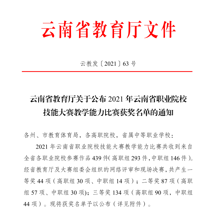 近日, 云南省教育厅发布《云南省教育厅关于公布2021年云南省职业院校技能大赛教学能力比赛获奖名单的通知》,新葡萄4支参赛教学团队分别荣获一等奖1个,二等奖2个,三等奖1个的佳绩。