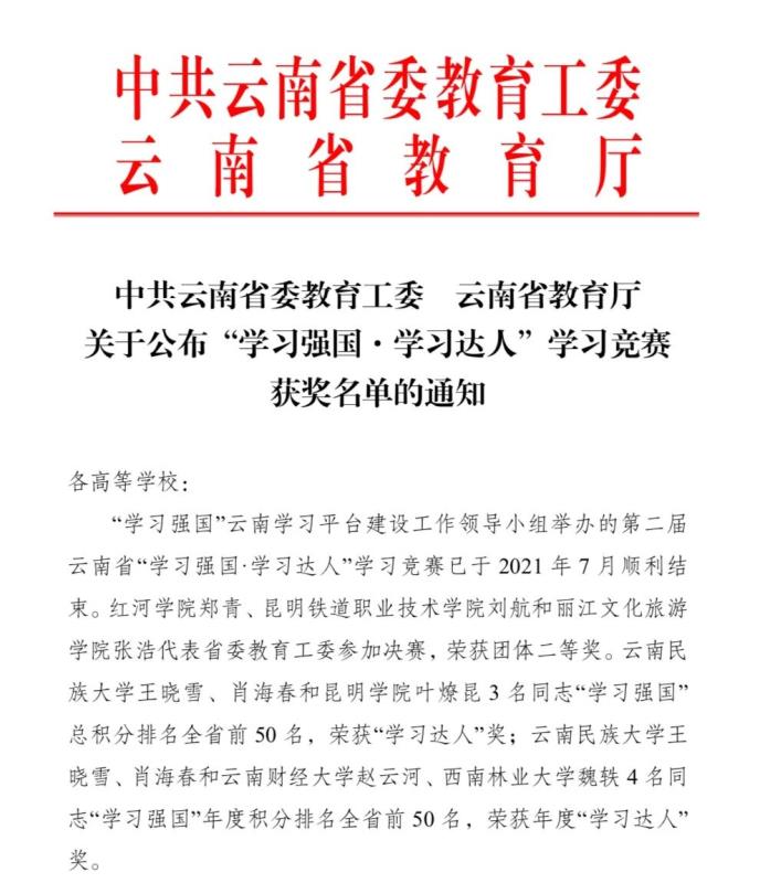 “庆祝中国共产党成立100周年——学百年党史·悟思想伟力·铸奋斗精神”第二届云南省“学习强国·学习达人”学习竞赛已于7月顺利结束。羊甫校区综合办教师刘航代表新葡萄参赛,经过激烈角逐,由刘航老师参与的云南省委教育工委代表队荣获团体二等奖。