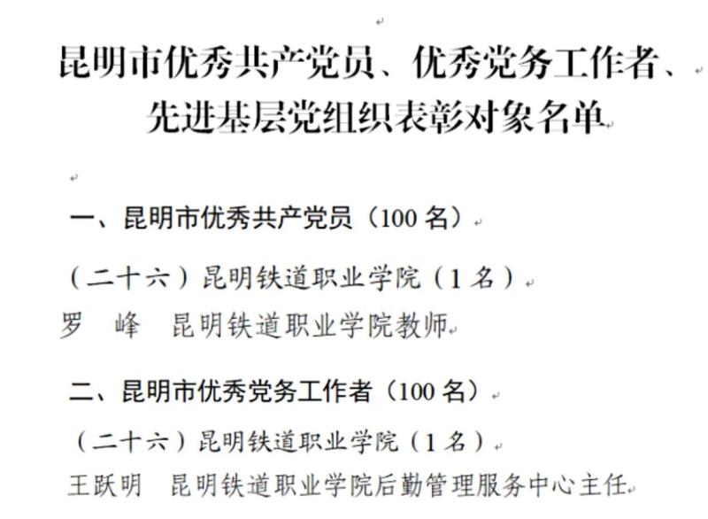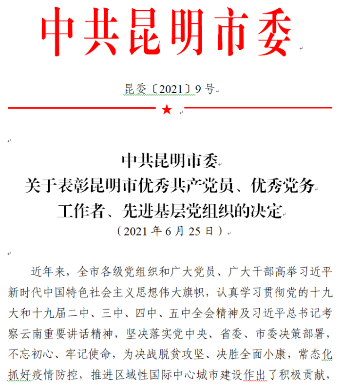 七一前夕,中共昆明市委对昆明市优秀共产党员、昆明市优秀党务工作者、昆明市先进基层党组织进行表彰。新葡萄罗峰同志荣获“昆明市优秀共产党员”称号,王跃明同志荣获“昆明市优秀党务工作者”称号。