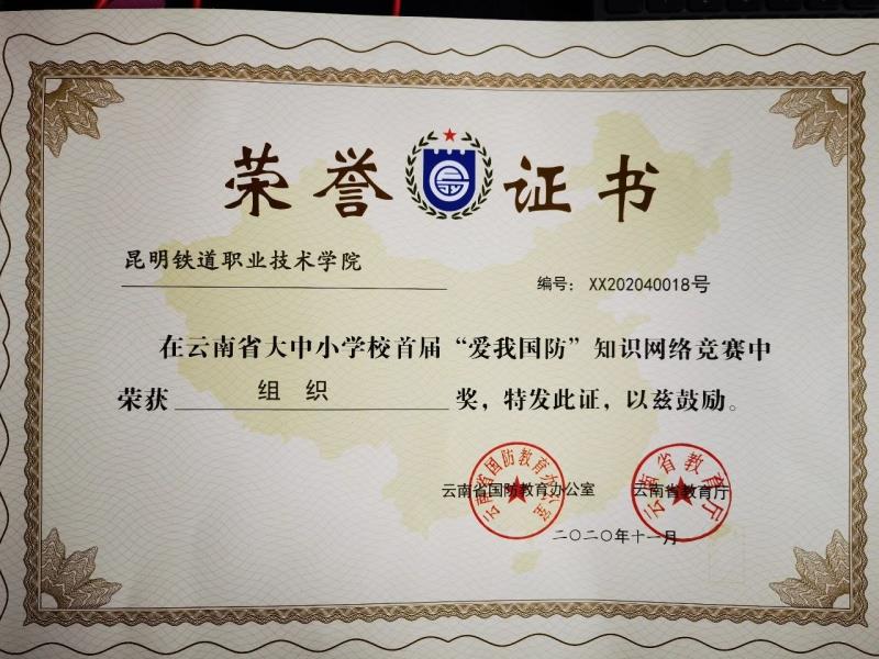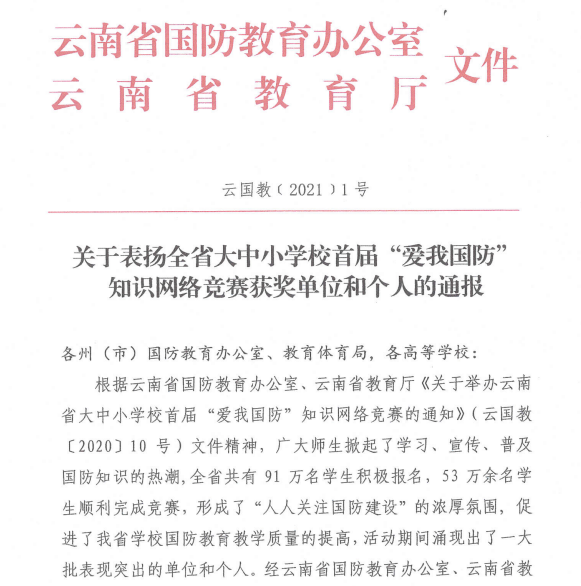 近日,云南省国防教育办公室、云南省教育厅下发了《关于表扬全省大中小学校首届“爱我国防”知识网络竞赛获奖单位和个人的通报》,新葡萄荣获组织奖,新葡萄教师张德军、周朝章、张永明荣获指导教师奖,新葡萄学生戚正鹏、尹隆胜等7位同学共获二等奖2名,三等奖5名。