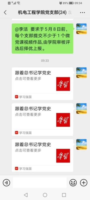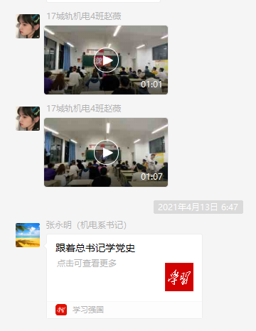 为深入推进党史学习教育,跟着习近平总书记学党史,传承好红色基因。机电工程学院党支部充分发挥党建带团建的示范引领作用,结合国防教育及征兵工作实际,党支部书记做好“领学,促学”,每天在党支部群及学生微信群推送“跟着总书记学党史”素材,要求师生每天抽出时间学党史、唱红歌军歌,开展学生班级每天“十分钟打卡”学党史、唱红歌军歌活动。