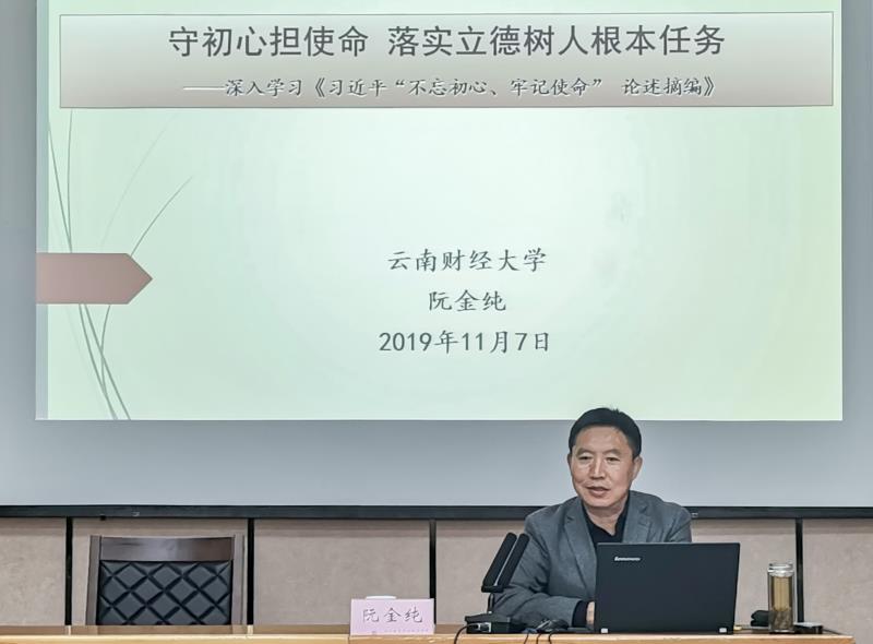 培训邀请了云南财经大学马克思主义学院院长、教授阮金纯作专题辅导。阮金纯教授以《守初心担使命 落实立德树人根本任务》为题,带领党员干部深入学习了《习近平“不忘初心、牢记使命”论述摘编》,他首先从理论、历史、实践三个维度来理解初心、使命的深刻内涵;其次通过五个方面阐述了准确把握守初心、担使命的根本要求;最后强调要把守初心、担使命落实在办学实践中。阮金纯教授为党员们上了生动、精彩的一堂党课,为全体党员干部进一步坚定理想信念、牢记宗旨性质、加强党性修养,为高质量统筹推进主题教育和学院的各项工作提供了坚强的精神动力。