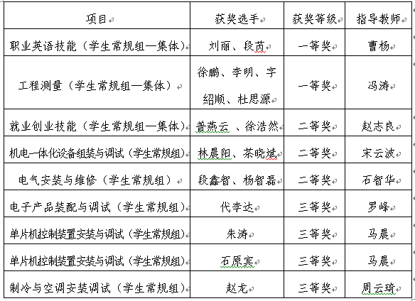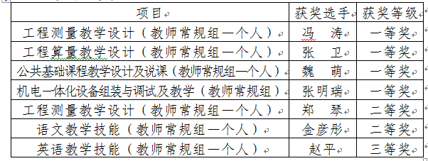 中职组团体奖:建筑技术类一等奖,电工电子类赛项二等奖和职业素养类二等奖。