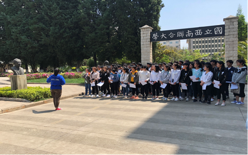 全体师生在解说员的带领下有序前往参观西南联大旧址。首先映入眼帘的是那块古旧却熠熠生辉的校门牌匾“國立西南聯合大學”。一路前行,看到当年三位校长的铜像,他们分别是蒋梦麟、梅贻琦、张伯苓三位前辈,此刻同学们的心中充满了敬佩之情。