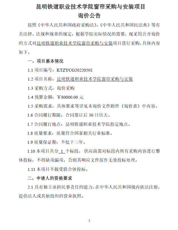 新葡萄AMG官方网站窗帘采购与安装项目询价公告(项目编号:KTZYCG20220501)
