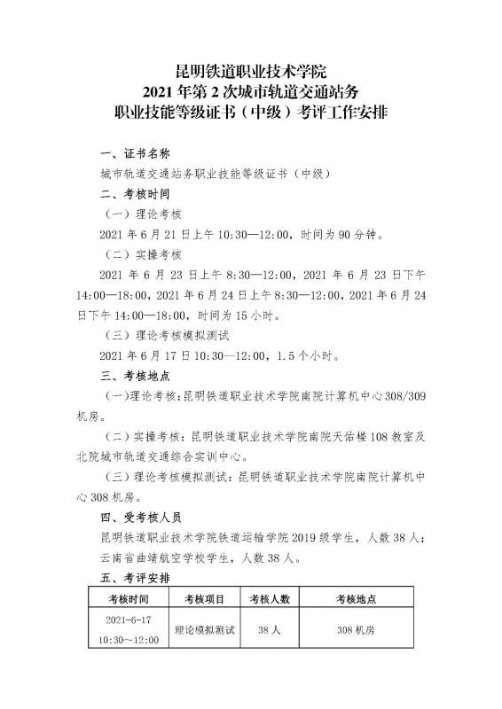 新葡萄AMG官方网站2021年第2次城市轨道交通站务职业技能等级证书(中级)考评工作安排