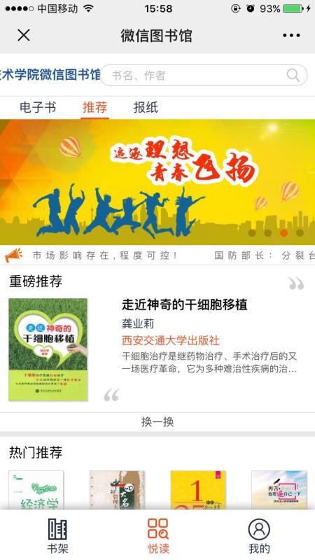 新葡萄AMG官方网站图书馆已于2019年5月10日在学院公众号平台中开通试用北京方正阿帕比技术有限公司的数字资源“微信图书馆”。微信图书馆资源丰富,有800000余册电子图书、500余份数字报纸可供读者选择阅读,欢迎广大师生积极关注、使用并提出宝贵意见。