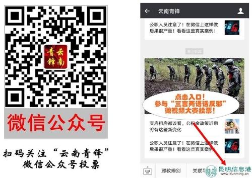 方式一:关注“云南青锋”微信公众号,通过菜单按钮进入大赛专属页面进行投票: