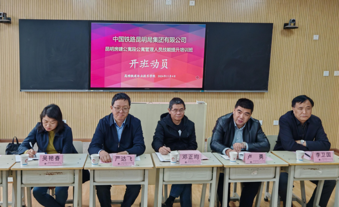 开班动员会上,学院副院长邓正均对参与本次培训的职工表示欢迎,希望全体参训学员争当勤思好学的模范、争当严守纪律的模范,要求学校相关部门全力支持本次培训工作,确保培训取得实效,达到既定目标。中国铁路昆明局集团有限公司昆明房建公寓段副段长严达飞对学院和昆明市就业促进会给予本次培训班的精心安排表示感谢,要求参训职工珍惜培训机会、做到学以致用。