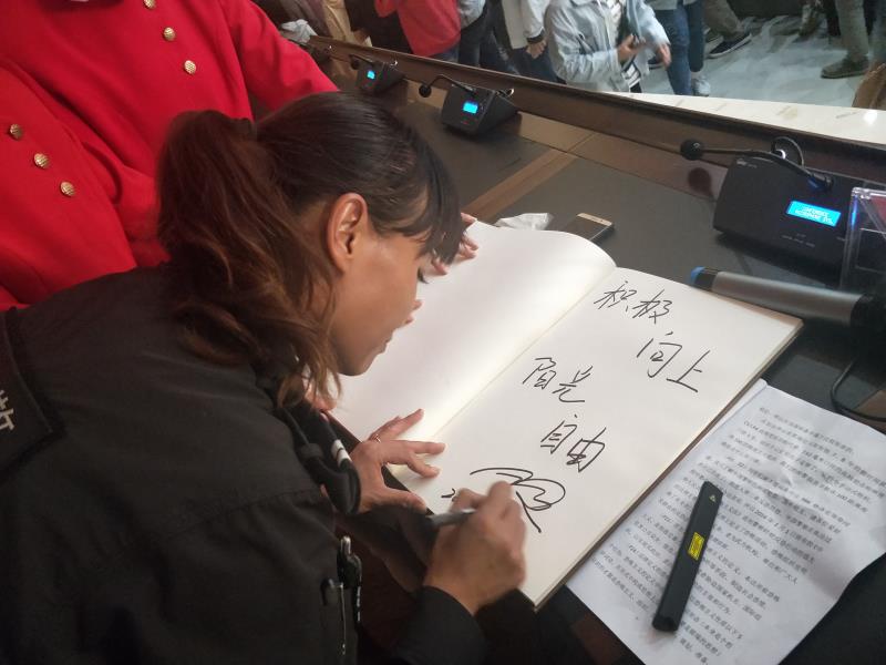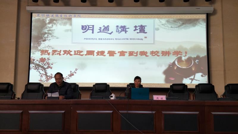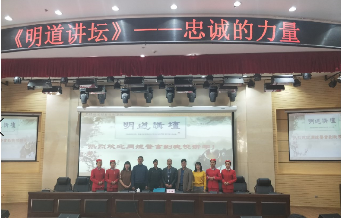 讲座最后,为了表示我院对周婕警官的感谢、对人民警察的敬意,铁道电气工程系书记赵伟老师为周警官献上了我院的校徽,并邀请周婕警官在《明道讲坛》签名册上留下了对我院学生的寄托与祝福,也与我院领导、老师、同学留下了合影。