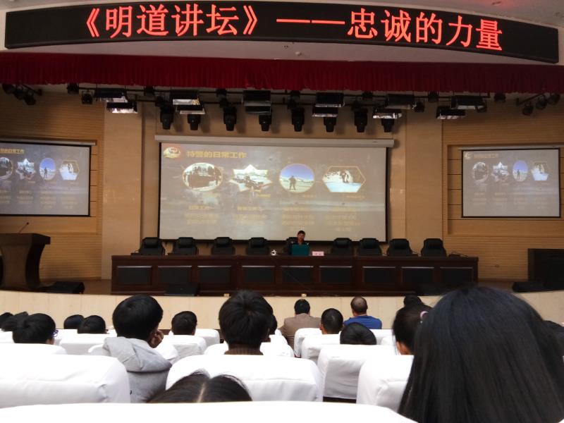 为了让当代大学生提高安全防范意识、学会知法、守法,也让当代青年了解特警工作、深入了解警营生活,以“忠诚的力量”为主题的新葡萄AMG官方网站《明道讲坛》于2018115日下午14:00在南院报告厅开讲了。本次讲座特别邀请了昆明市公安局特警支队的周婕警官为主讲嘉宾,由乔副院长主持,我院各系领导、老师和近480名学生代表到场聆听了本次讲座。