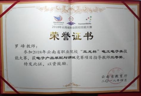 2018.04 云南省电工电子技能大赛优秀指导教师三等奖。