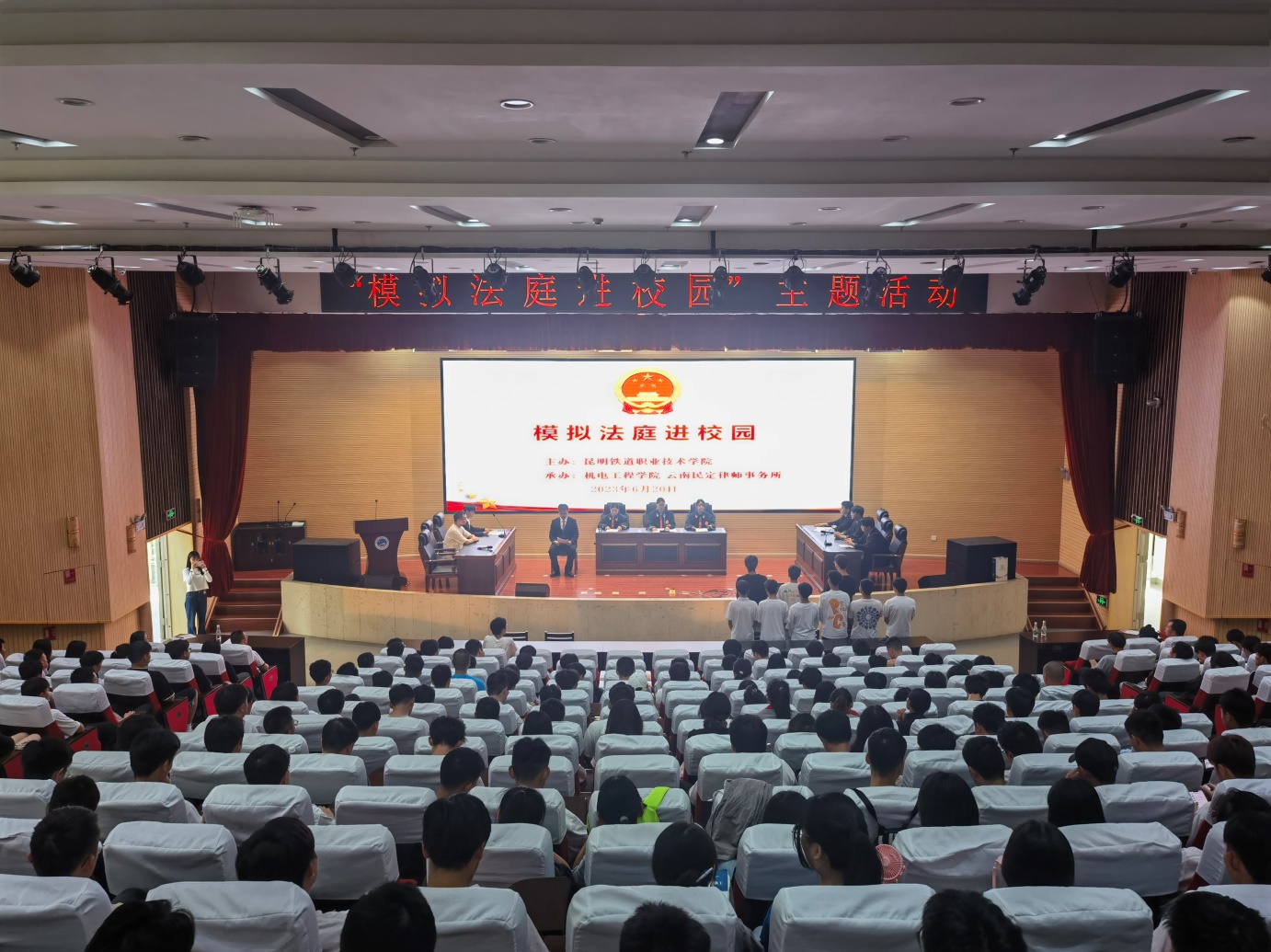 为了进一步引导学生树立尊法守法用法的意识,推进法制教育的实效性,营造良好的法制教育环境和氛围。按照学校“2023年普法强基补短板专项行动实施方案”工作要求,6月20日下午,学校联合和云南民定律师事务所在睿知楼报告厅联合开展“模拟法庭进校园”活动。活动选取“同学在食堂插队打饭,引发争吵,并携带管制刀具将同学砍伤,造成故意伤害罪”的案例进行模拟庭审。