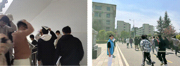 演练分为地震和火灾疏散逃生演练两部分,首先进行的是地震逃生演练。中午12时40分,机电工程学院及铁道运输学院全体班主任和学生在教室集合,保卫处、学生处工作人员、辅导员老师及志愿者按时到达指定位置。12时45分,李瑞林院长下达演练开始命令后,疏散演练正式开始。