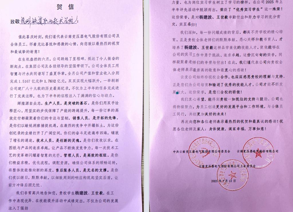 近日,云南变压器电气股份有限公司向新葡萄发来贺信,表彰新葡萄机电工程学院和电气工程学院两名2025届毕业生杨建波和王世毅在实习期间的优异表现,并对新葡萄人才培养质量给予高度评价。