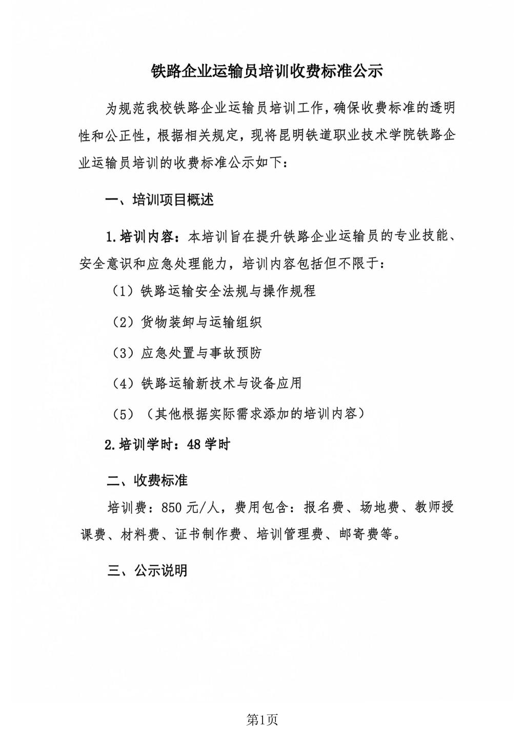 铁路企业运输员培训收费标准公示