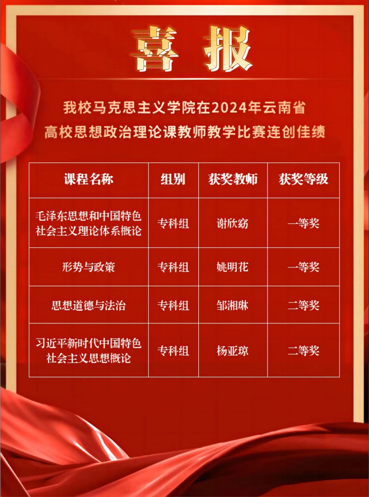 近日,云南省2024年高校思想政治理论课教师教学比赛结果公示。新葡萄思政课教师谢欣窈、姚明花、邹湘琳、杨亚琼代表学院参赛,经过预赛选拔后全部进入决赛,并最终荣获一等奖2项、二等奖2项,学院荣获优秀组织奖,实现该赛项的新突破。
