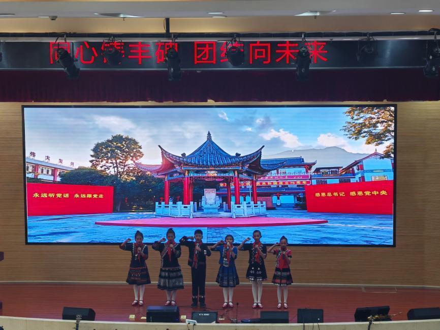 在交流活动中,宁洱民族团结实验小学的学生们以“小小收信人”的身份,以稚嫩而坚定的声音,深情讲述了“普洱民族团结誓词碑”背后的感人故事。小学生们身着民族服饰,现场演唱了学校精心创编的三首歌曲,展现了孩子们对家乡的热爱,也表达着对民族团结、和谐共处的美好愿景,赢得现场师生的阵阵掌声。新葡萄AMG官方网站学生也送上了精彩的歌舞表演。