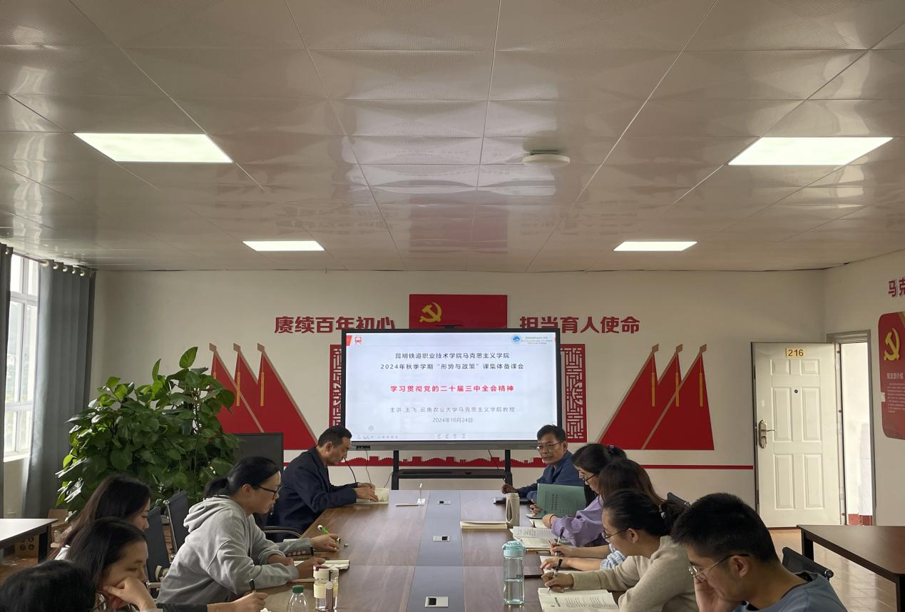 为深入学习贯彻落实教育部《关于做好2024学年秋季学期全国高校“形势与政策”教学工作的通知》《中共云南省委教育工委关于做好2024年秋季学期“形势与政策”教学工作的通知》,全面做好2024年秋季学期“形势与政策”课教育教学工作,马克思主义学院于2024年10月24日召开2024年秋季学期“形势与政策”课集体备课会。会议邀请云南农业大学马克思主义学院王飞教授为全体思政课教师讲授《学习贯彻党的二十届三中全会精神》专题讲座。