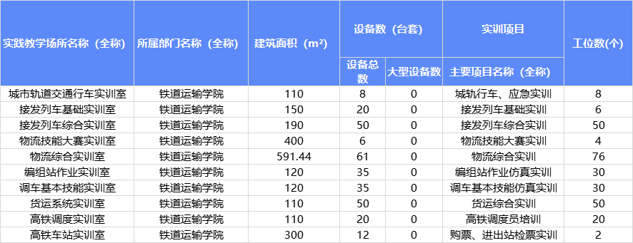 铁道运输学院设有城市轨道交通行车实训室、接发列车基础实训室、接发列车综合实训室、物流技能大赛实训室、物流综合实训室、编组站作业实训室、调车基本技能实训室等10个专业实训室,为学生培养实践技能提供了良好的实训条件。