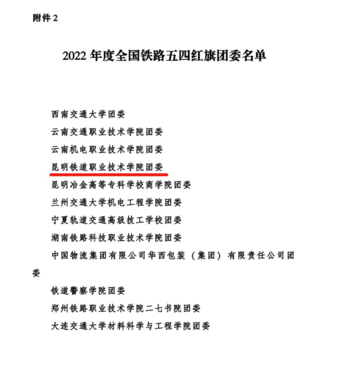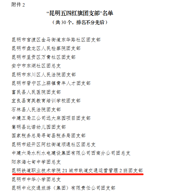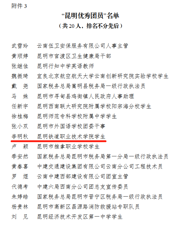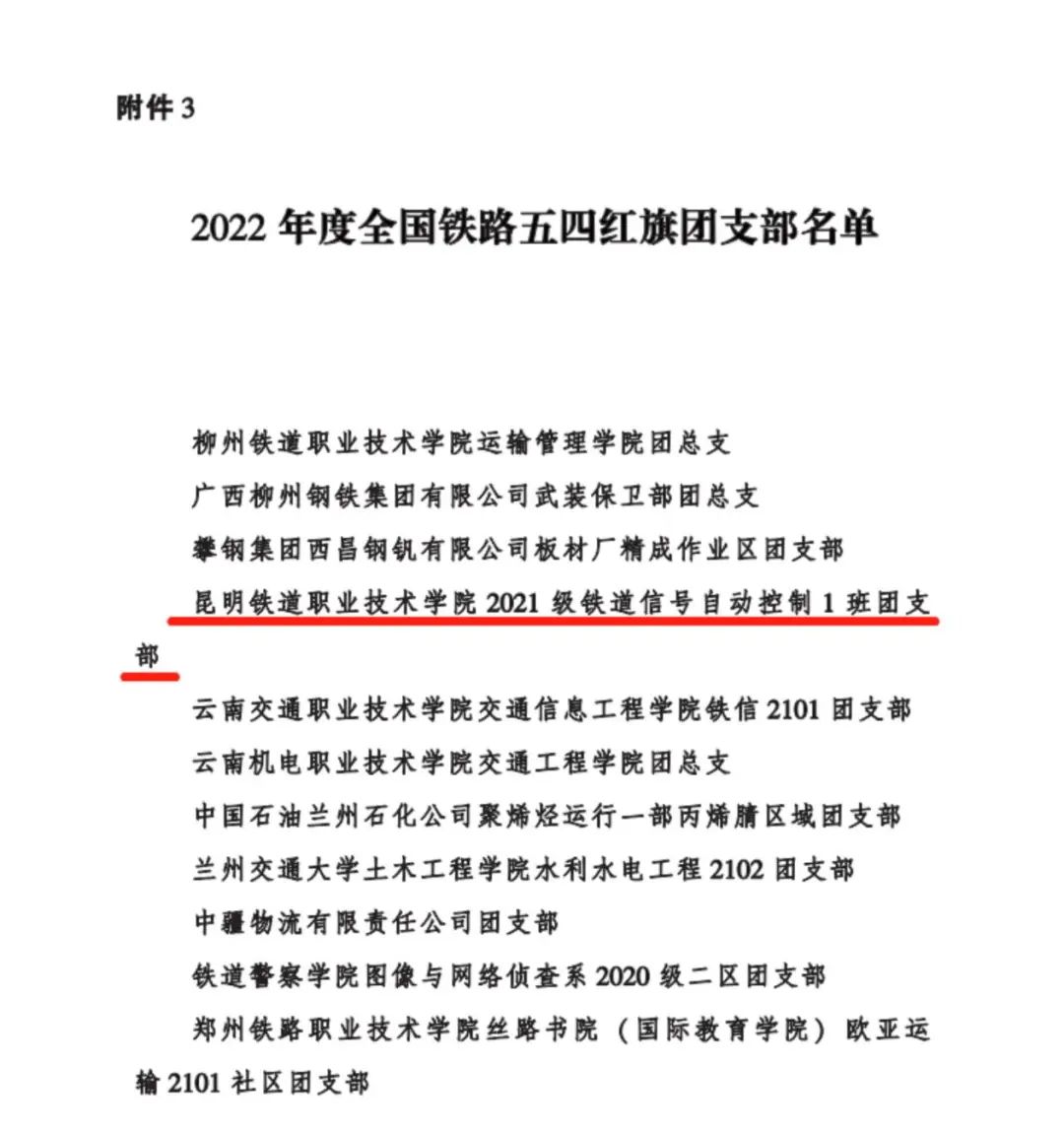 在共青团昆明市委下发的《共青团昆明市委关于2022年度“昆明市五四红旗团委”“昆明市五四红旗团支部”“昆明市优秀共青团干部”“昆明市优秀共青团员”选树情况的通报》中获悉,新葡萄2021级城市轨道交通运营管理2班团支部荣获2022年度“昆明市五四红旗团支部”,2020级铁道机车车辆制造与维护2班李明秋荣获“昆明优秀共青团员”。