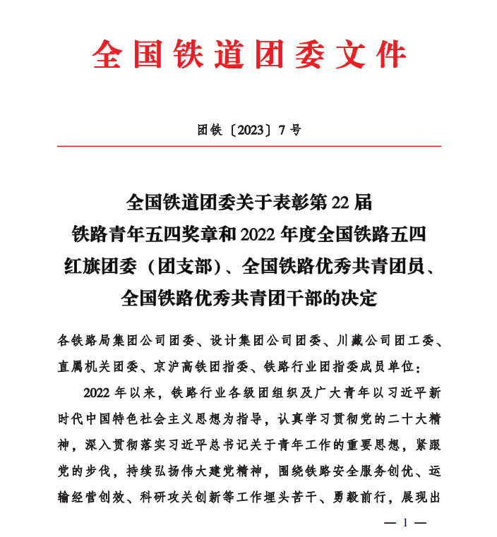 近日,在全国铁道团委下发的《全国铁道团委关于表彰第22届铁路青年五四奖章和2022年度全国铁路五四红旗团委(团支部)、全国铁路优秀共青团员、全国铁路优秀共青团干部的决定》中获悉,新葡萄团委荣获2022年度“全国铁路五四红旗团委”荣誉称号,新葡萄2021级铁道信号自动控制1班团支部荣获“全国铁路五四红旗团支部”。