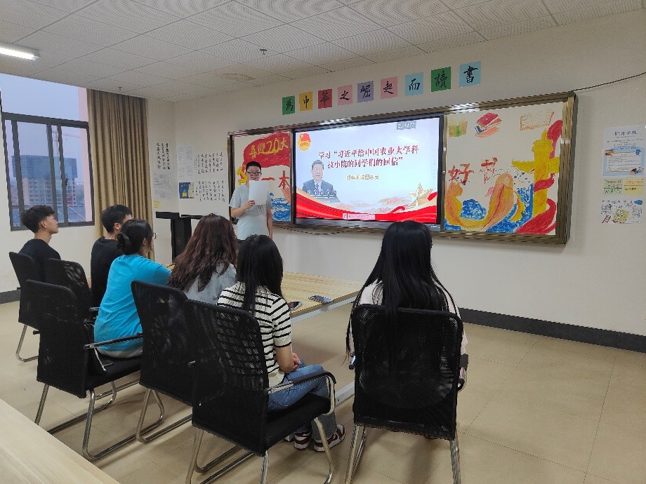 会议进行过程中,首先由团总支宣办部干事罗琛锦同学带领团总支全体成员学习:习近平给中国农业大学科技小院的同学们的回信内容。习总书记在信中向全国广大青年致以节日的祝贺,同时强调“你们在信中说,走进乡土中国深处,才深刻理解什么是实事求是、怎么去联系群众,青年人就是要‘自找苦吃’,说得好,新时代中国青年就应该有这股精气神。”光阴回眸间,中国特色社会主义进入新时代,这封回信,激励着广大青年担当起党和人民赋予的历史重任,充分显现了“确保党的事业薪火相传,确保中华民族永续发展”的深谋远虑,因此总书记的回信,不仅是写给科技小院的同学们,也是向广大青年提出号召:在民族复兴的大舞台上建功立业,为全面建设社会主义现代化国家贡献青春力量。学习完这封回信,团总支的同学们都深有感触,组织部干事徐源同学表示:新的时代对当代青年提出了新的要求,带来了新的挑战,同时也带来了新的机遇。 所以在新的时代面前,青年以何种姿态面对,显得尤为重要,作为中国青年,我们更应需要加强自我认知与学习能力,为中国特色社会主义的建设献出一份属于自己的力量。实现中华民族伟大复兴,是一场接力长跑。青年兴则国家兴,中国发展要靠广大青年挺身而出,勇于担当。在以中国式现代化全面推进中华民族伟大复兴的前进道路上,必然会出现各种各样的重大考验,青年需以以勇气和创新迎难而上、担起使命。让我们不畏一切艰难险阻,坚定不移的听党话、跟党走,有理想、敢担当、能吃苦、肯奋斗,用青春和汗水创造出属于新时代青年的骄傲和辉煌。