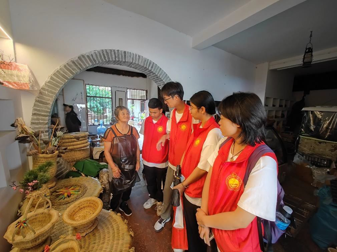 团山村草编非遗传承人向团队成员讲述销售草编制品发家致富的故事