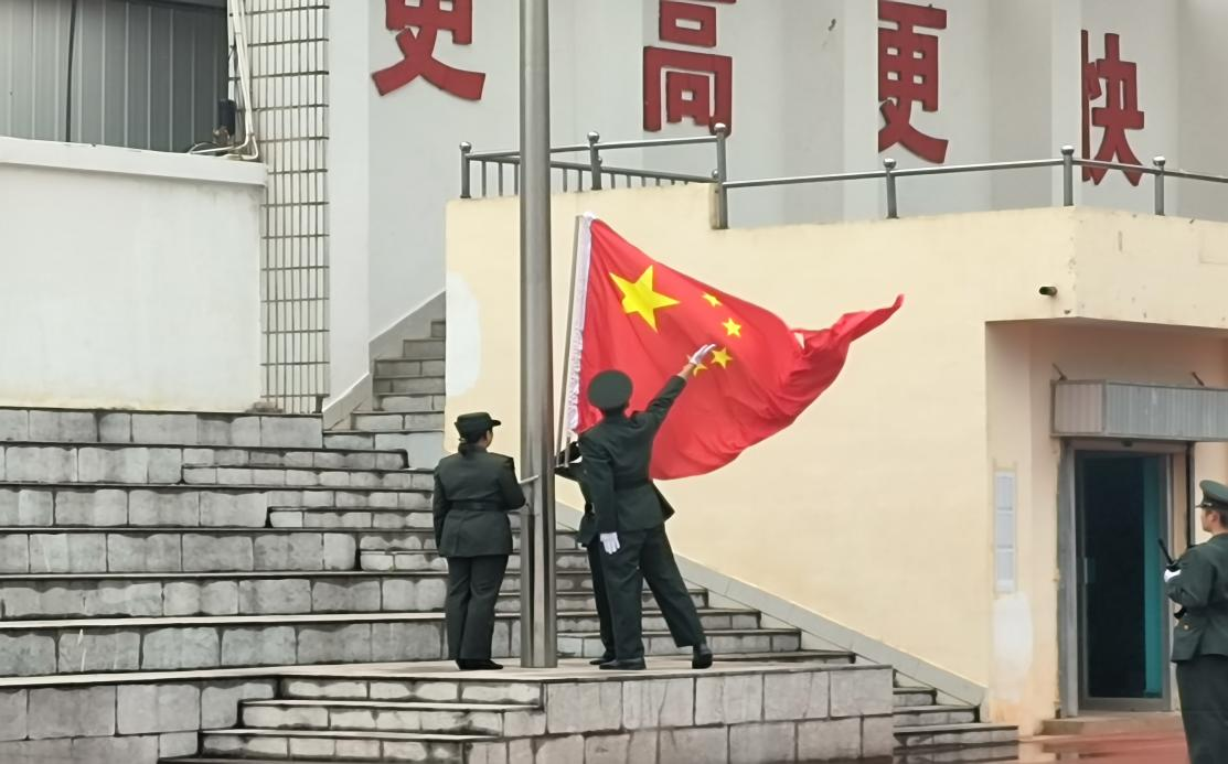 升旗仪式开始,国旗队高喊整齐嘹亮的口号、迈着铿锵有力的步伐,护送国旗入场。在庄严的《义勇军进行曲》中,鲜艳的五星红旗冉冉升起,全体师生肃立,向国旗行注目礼,心中激荡着对祖国的崇高敬意和无限热爱,以及对新学期的期待与憧憬。