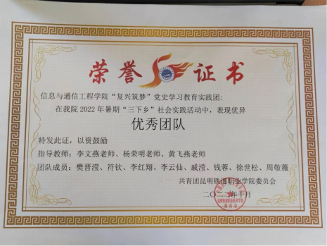 指导学生参加2022年暑期“三下乡”社会实践活动获得优秀团队奖