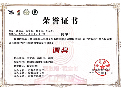 指导学生参加第八届云南省互联网+大学生创新创业大赛获得铜奖
