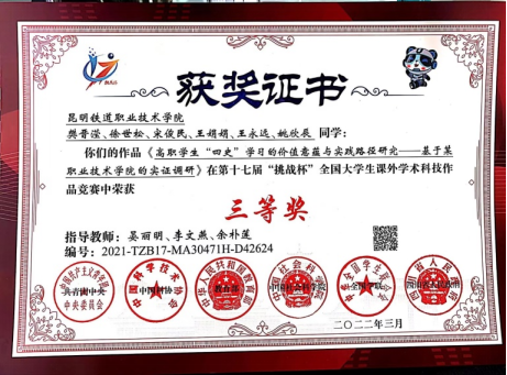 指导学生参加第十七届“挑战杯”全国大学生课外学术科技节竞赛获得三等奖