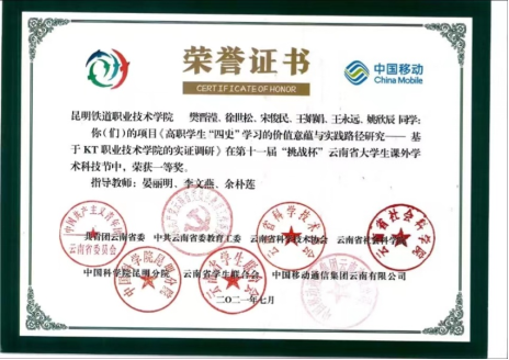指导学生参加第十一届“挑战杯”云南省大学生课外学术科技节竞赛获得一等奖