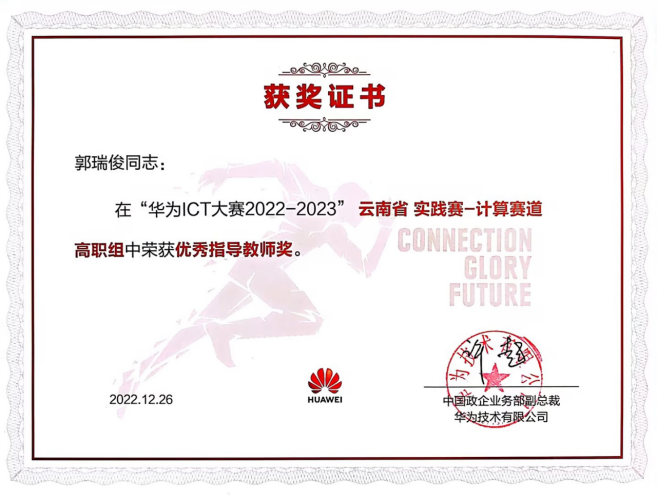 姓名:郭瑞俊 时间:2022年12月,指导学生参加《华为ICT大赛2022-2023云南 省实践赛-计算赛道》比赛获得一等奖。