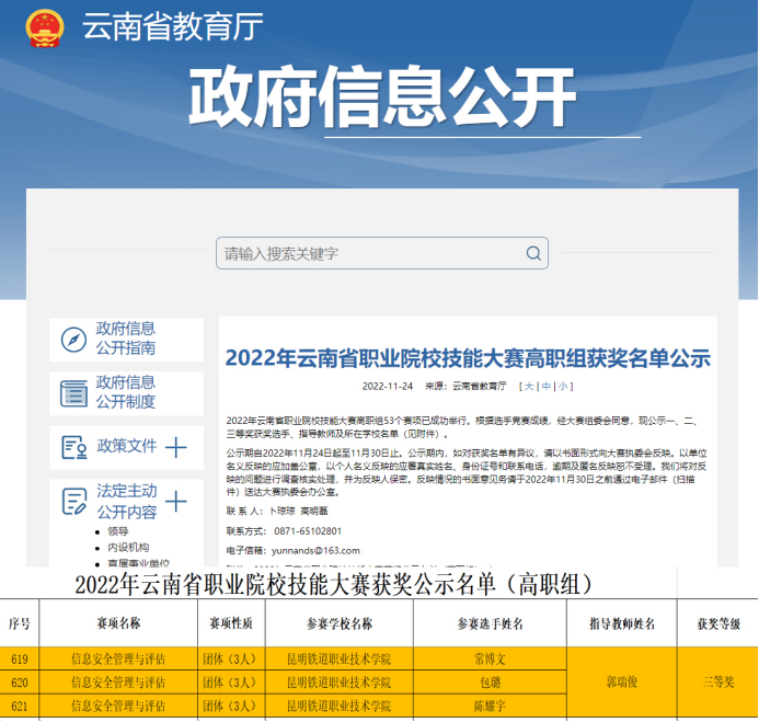 姓名:郭瑞俊 时间:2022年11月,指导学生参加《2022年云南省职业院校技能大赛信息安全与评估》比赛获得三等奖。