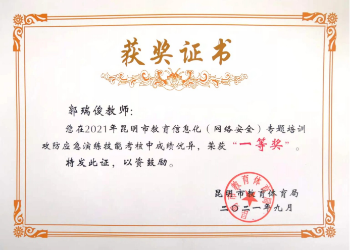 姓名:郭瑞俊 时间:2021年9月,参加《昆明市教育信息化(网络安全)专题培训攻防应急演练》比赛获得一等奖。