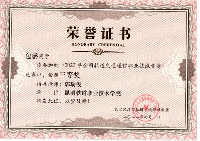 姓名:郭瑞俊 时间:2022年7月,指导学生参加《2022年全国轨道交通通信职业技能竞赛》比赛获得三等奖。