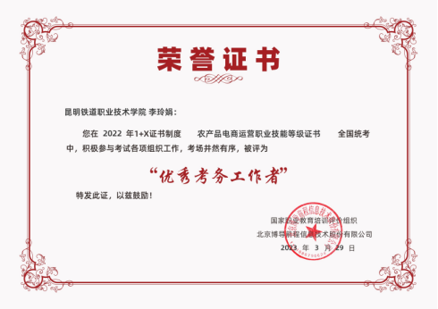 积极参与2022年“农产品电商运营1+X考试”各项组织工作,荣获优秀考务工作者。