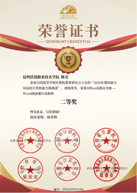 指导学生参加“2022年第四届全国高校计算机能力挑战赛”,荣获office高级应用赛-word西南赛区高职组决赛二等奖。
