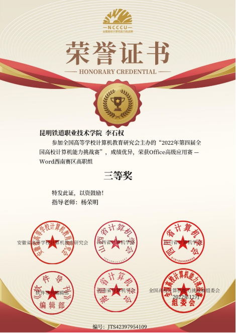 指导学生参加“2022年第四届全国高校计算机能力挑战赛”,荣获office高级应用赛-word西南赛区高职组决赛三等奖。