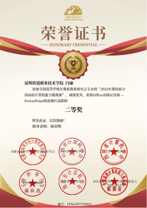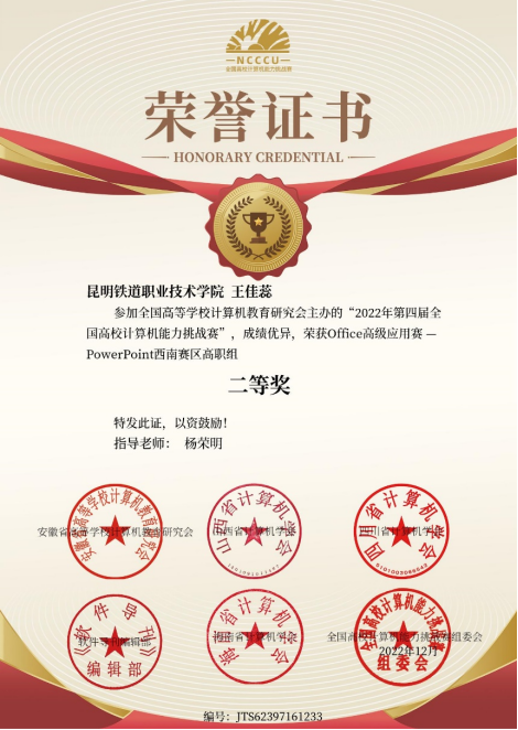 指导学生参加“2022年第四届全国高校计算机能力挑战赛”,荣获office高级应用赛-PowerPoint西南赛区高职组二等奖。