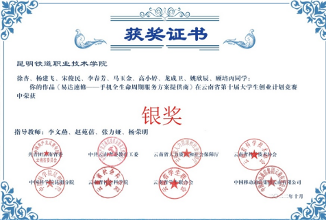指导学生参加“云南省第十届大学生创业计划竞赛”,荣获银奖。