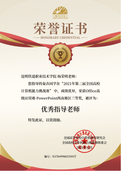 指导学生参加“2021年第三届全国高校计算机能力挑战赛”,荣获office高级应用赛-PowerPoint西南赛区三等奖。