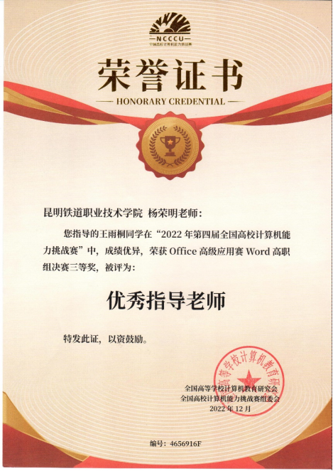 指导学生参加“2022年第四届全国高校计算机能力挑战赛”,荣获office高级应用赛-word西南赛区高职组一等奖。