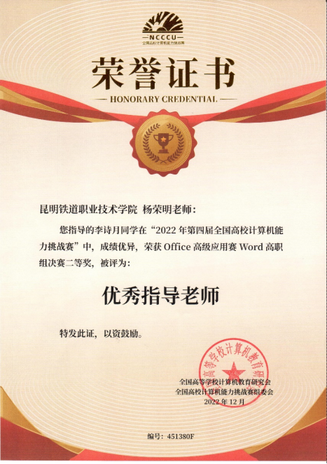 指导学生参加“2022年第四届全国高校计算机能力挑战赛”,荣获office高级应用赛-word西南赛区高职组二等奖。