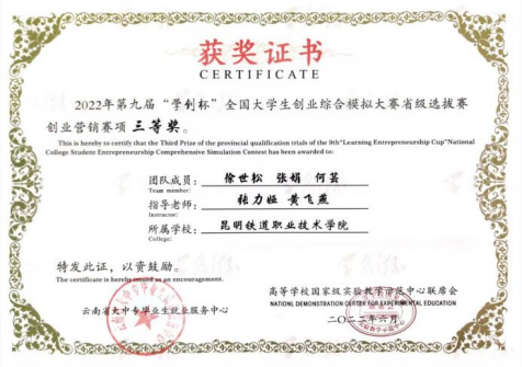 指导学生参加2022年云南省职业院校技能大赛市场营销技能赛项获得三等奖