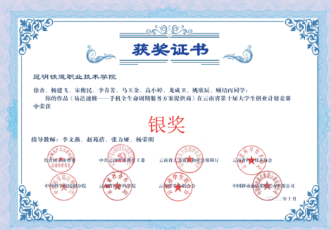 指导学生参加云南省第十届大学生创业计划竞赛获得银奖