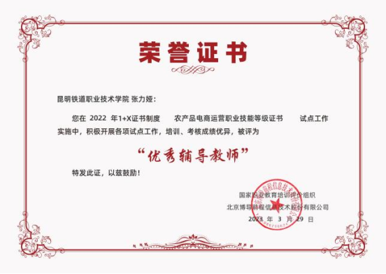 参加2022年1+X证书制度农产品电商运营职业技能等级证书试点工作中被评为“优秀辅导教师”
